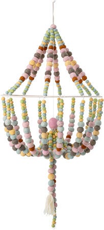 Den är utformad som en takkrona och är tillverkad av fina små filtade bollar i många olika färger. Bollarna är knuta på en stomme av stål och de klara färgerna funkar bra till alla typer av barnrum. Vare sig du vill använda denna som en klassiks mobil över sängen eller om du vill ha den mitt i rummet, eller kanske i något hörn, så blir det ett jättefint resultat.